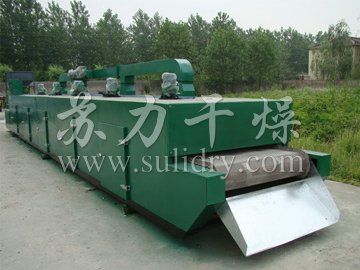 物料由加料器均勻地鋪在網(wǎng)帶上,網(wǎng)帶一般采用12-60目不銹鋼絲網(wǎng),由傳動(dòng)裝置拖動(dòng)在干燥機(jī)內(nèi)移動(dòng)。干燥機(jī)由若干單元組成,每一單元熱風(fēng)獨(dú)立循環(huán),部分尾氣由專門(mén)排濕風(fēng)機(jī)排出,廢氣由調(diào)節(jié)閥控制,熱氣由下往上或由上往下穿過(guò)鋪滿物料的網(wǎng)帶完成熱量與質(zhì)量傳遞的進(jìn)程,帶走物料水份。網(wǎng)帶緩慢移動(dòng),運(yùn)行速度可根據(jù)物料溫度自由調(diào)節(jié),干燥后的成品連續(xù)落入收料器中。上下循環(huán)單元根據(jù)用戶需要可靈活配備,單元數(shù)量亦可根據(jù)需要選取。